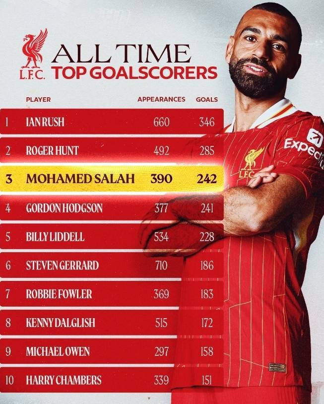 本场比赛取得进球后,萨拉赫已经为利物浦打进242球,跻身红军队史射手榜第三位。